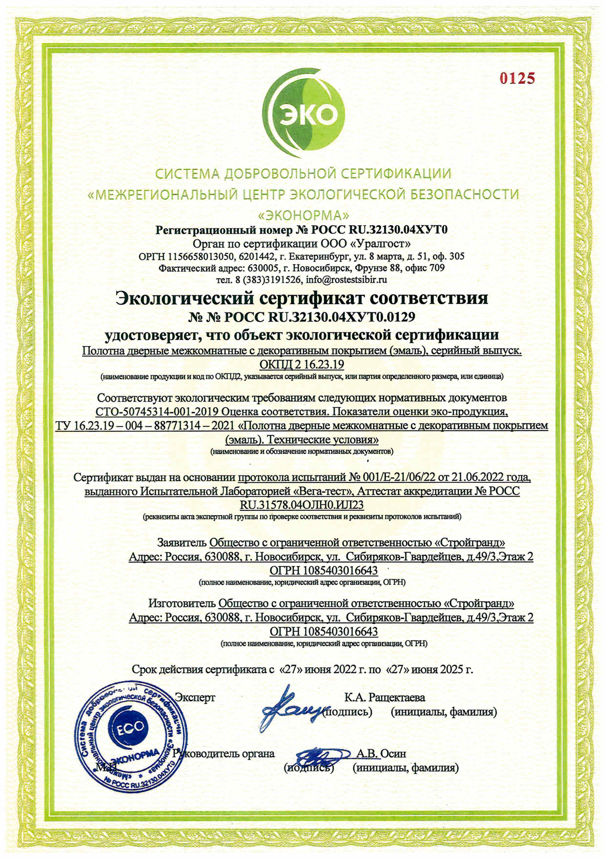 Сертификат экологической безопасности покрытия Эмаль